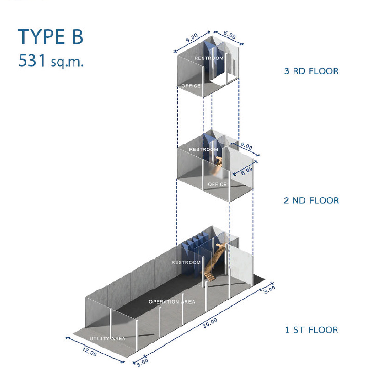 Office Area : 117 ㎡ Other Area : 36 ㎡ Building Dimension : 12X36 m. Building Type : Attach Zone Type General Zone