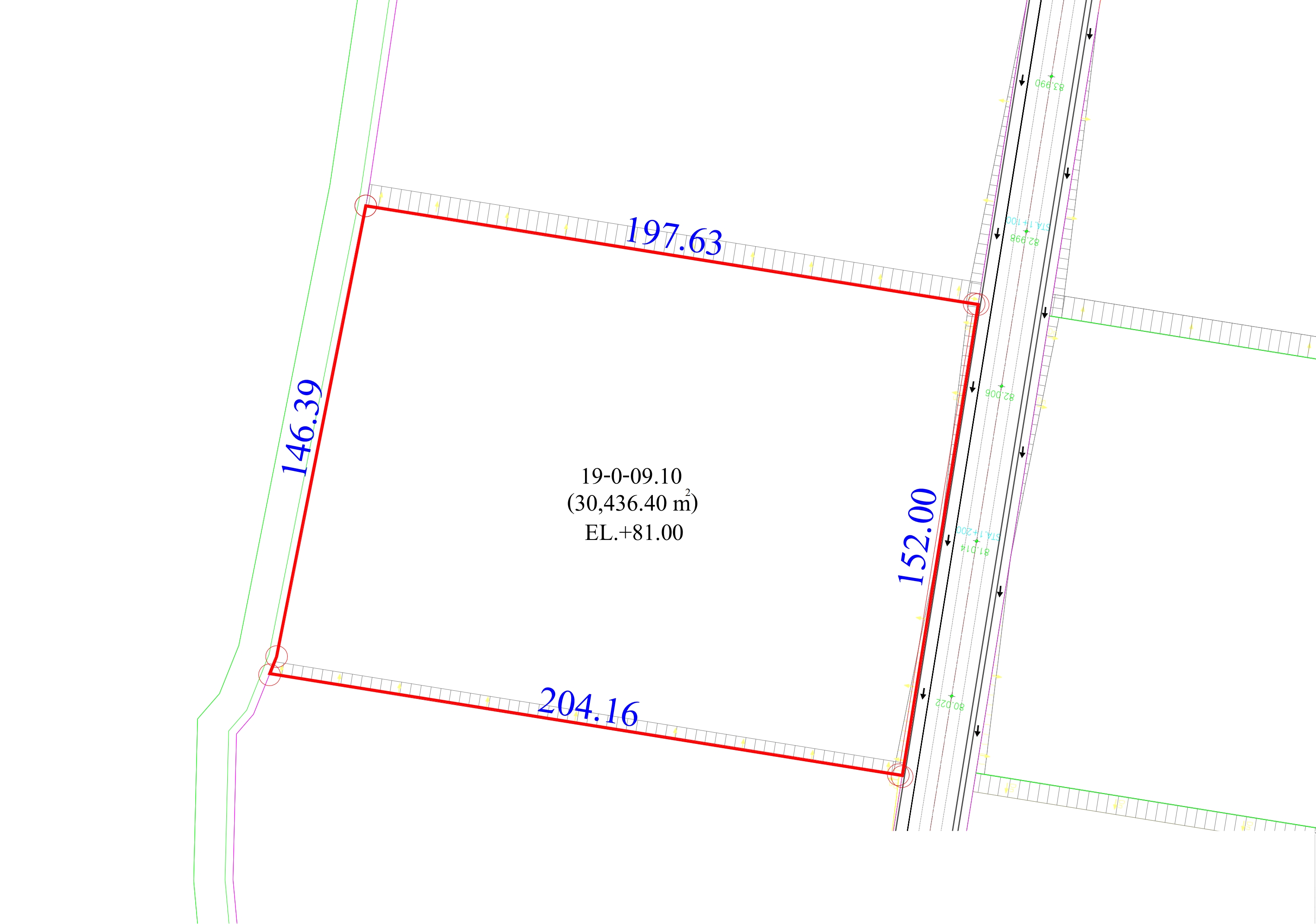 19-0-9.1 ไร่ (30,436.4 ㎡)ขนาดที่ดิน (กว้าง X ยาว) : 204.1X146.3 m.
