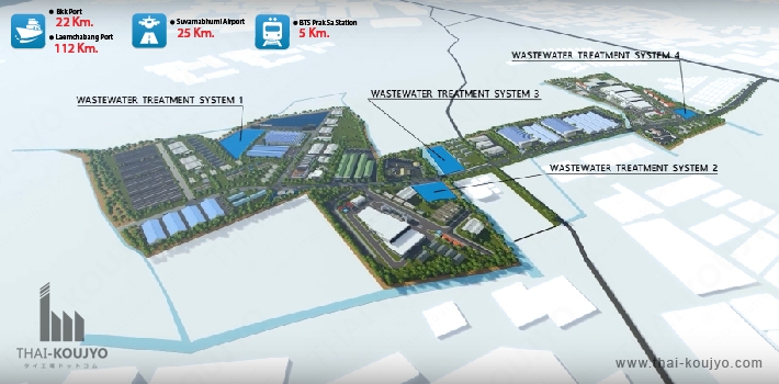 One Stop Service - Providing a one stop service and privileges in cooperation with the Industrial Estate Authority of Thailand Labor Pool - Abundance of nearby labor pool can be sourced to support industrial and manufacturing expansion. Eco Industrial - Town Developed in accordance with the Eco Industrial Town approach Logistics - Being a logistics hub with access to airport, port and major expressways. 5 Km. To BTS Only 5 - kilometers away from Phraek Sa BTS Station. Flood-free area - The project in located in the flood-free zoneView detail of this I.E. | I.E. Introduction List